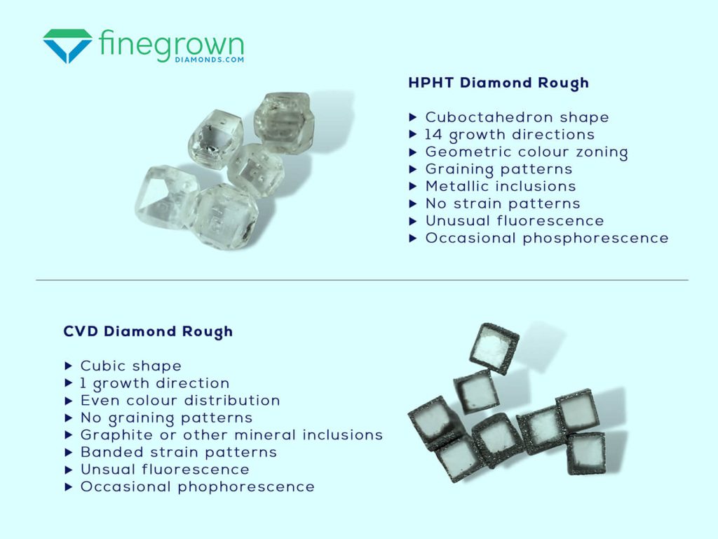 There are major differences between HPT diamonds and CVD diamonds in just of growing processors for their morphologies techniques used. HPHT diamonds grow in cuboctahedron shape and have 14 growth directions, while CVD diamonds grow cubic and have 1 growth direction, while CVD diamonds grow cubic and have 1 growth direction.